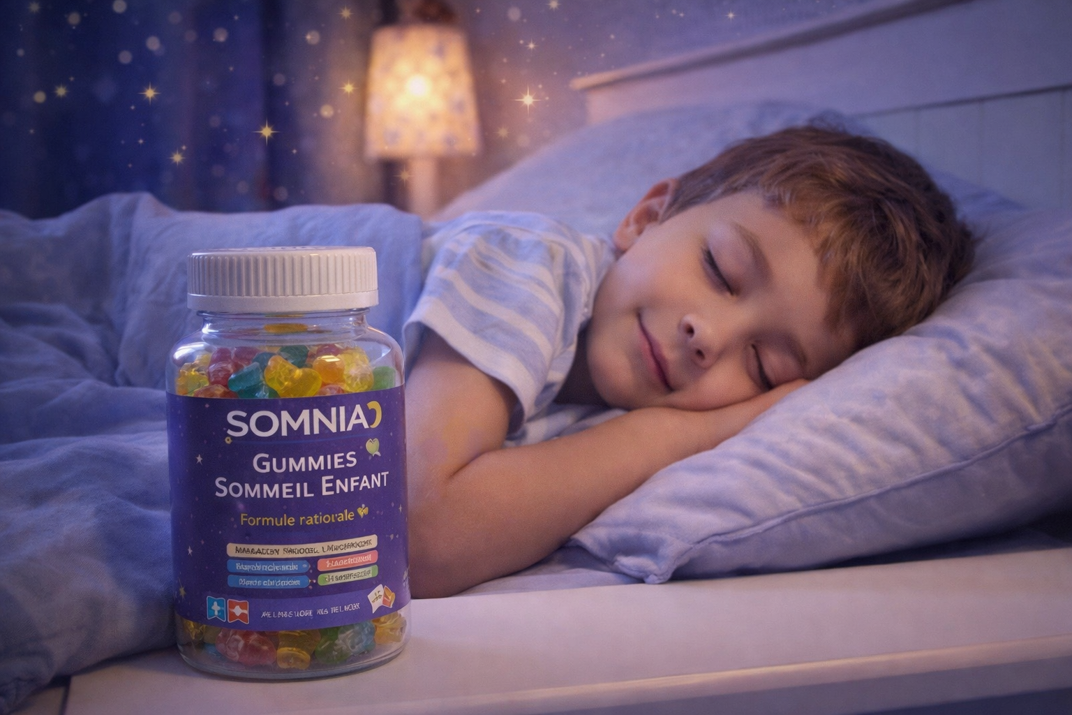Les gummies SOMNIA Sommeil Enfant sont un complément formulé pour aider les enfants à s’endormir plus facilement et à profiter d’un sommeil plus paisible. Elles accompagnent naturellement la routine du coucher.